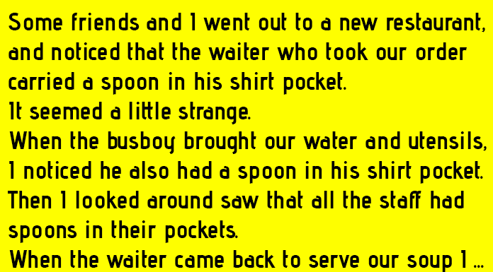 Some friends and I went out to a new restaurant, and noticed that the waiter who took our order carried a spoon in his shirt pocket.