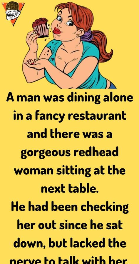 A man was dining alone in a fancy restaurant and there was a gorgeous redhead woman sitting at the next table.