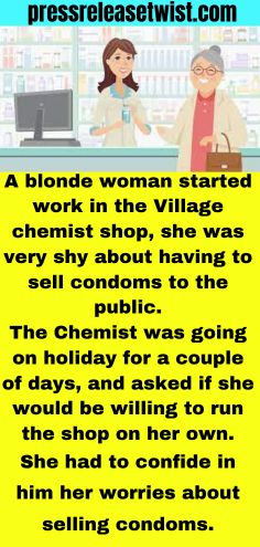 A blonde woman started work in the Village chemist shop, she was very shy about having to sell condoms to the public.